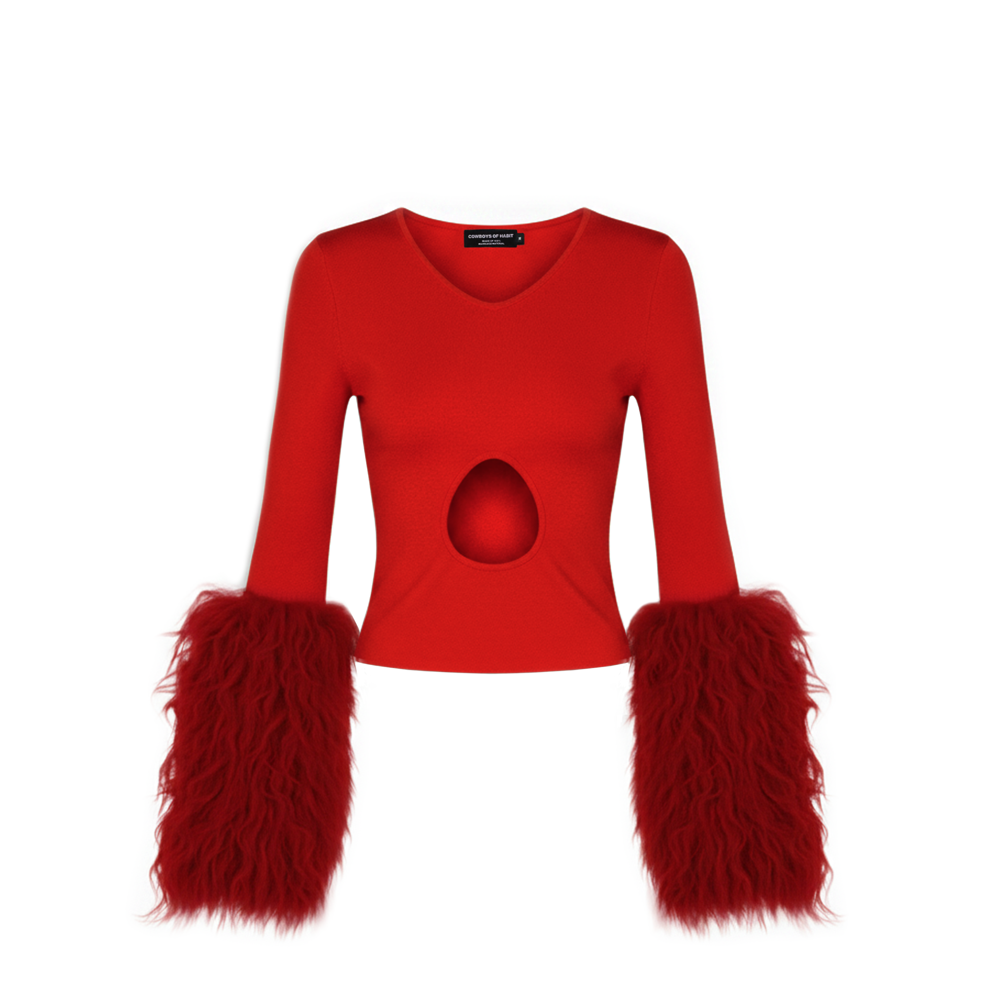 Sculpting stretch top with scoop neckline and front cut-out. Detachable shearling cuffs, wear the top with or without.